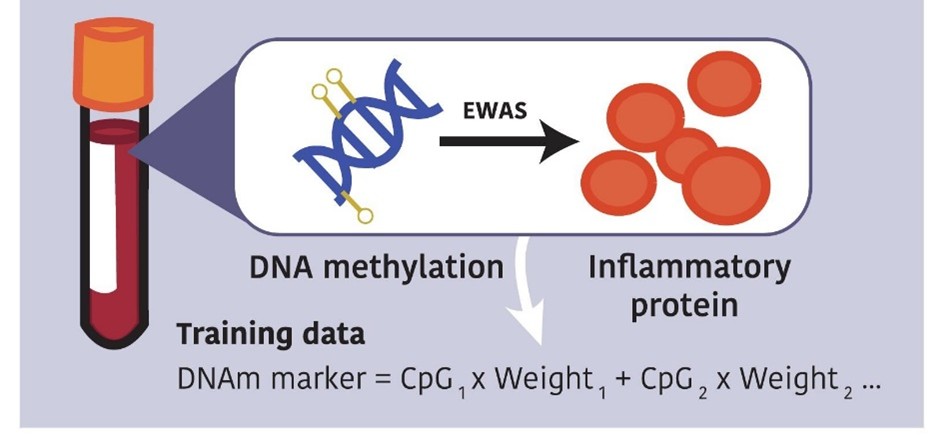 Researchers can perform an EWAS in a large group of individuals to train a DNAm marker: a weighted sum of methylation levels across important CpG sites. This biomarker can then be applied to any group of people with epigenetic data, to investigate relationships between inflammation and mental health.