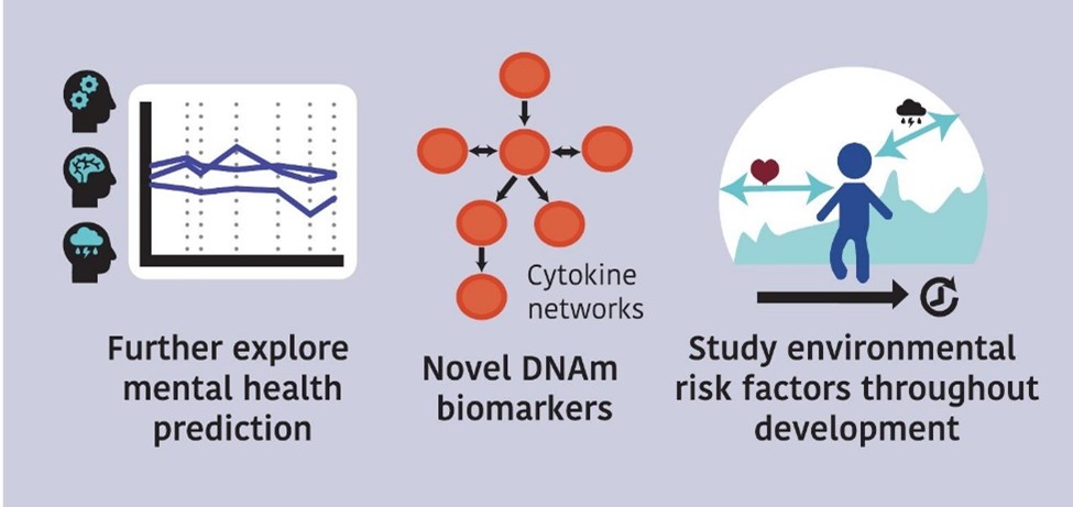 Figure 2 Recommendations for future research. Further explore mental health prediction by evaluating a wider range of epigenetic biomarkers and mental health outcomes. Develop novel DNAm biomarkers using larger and richer datasets. Study environmental risk factors throughout development to understand how the immune system responds to the environment in which youth grow up.